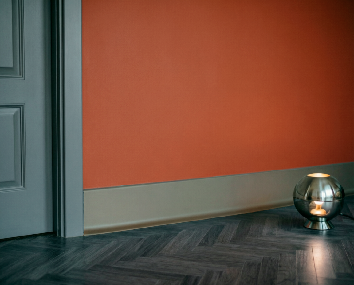 На фото — темный графитовый пол и стена насыщенного терракотового оттенка. Плинтус цвета «шампань» выступает в роли идеального связующего звена.